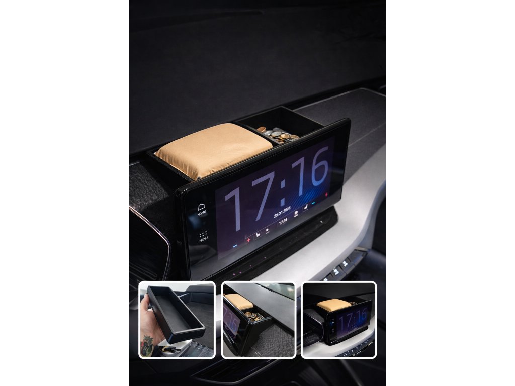 Umožňuje efektivně využít prostor za obrazovkou infotainmentu a přehledně uschovat drobnosti, které chcete mít po ruce – parkovací lístek, klíče nebo mince.